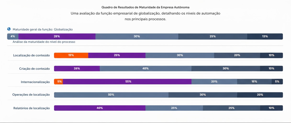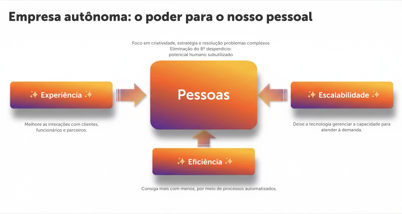 Um resultado desses esforços é o nosso novo Quadro de Resultados da Empresa Autônoma, que nos permite pontuar processos e funções comerciais com base no seu nível de autonomia. Esses níveis variam de processos totalmente manuais, sem automação, a processos assistidos por IA, nos quais humanos e IA colaboram, até processos autônomos, concluídos sem envolvimento humano.