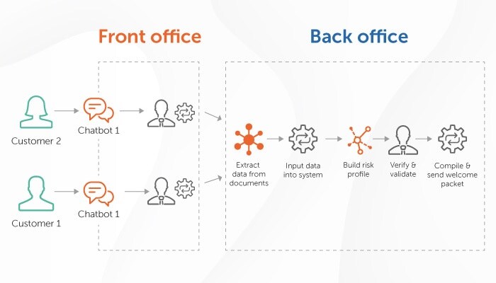 Automation can help glue disparate systems and processes together. It can simplify the process by requesting as little data as possible and populating the rest of the registration form. Bots can also automatically communicate onboarding status and proactively engage customers when their next interaction is required.