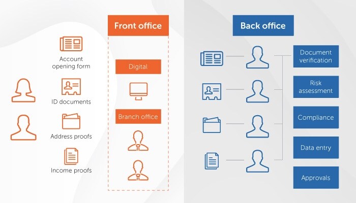 As you can see, the back-office tasks include a variety of checks and processes across departments (credit, legal, operational, for example) that can significantly impact the amount of time to open a bank account. Adding to the complexities, departments have their own processes that are specific to their entity within the bank.