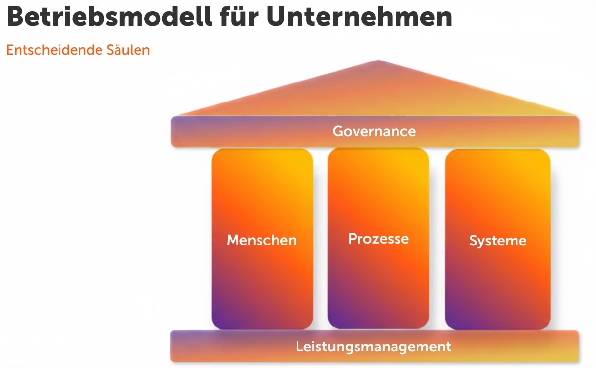 Wir haben außerdem das People-Process-Technology Framework zu einem People-Process-Systems Enterprise Operating Model weiterentwickelt, das durch Performance Management unterstützt und mittels Governance gesteuert wird. So passen sich die verschiedenen Elemente der heutigen KI-unterstützten Realität an: