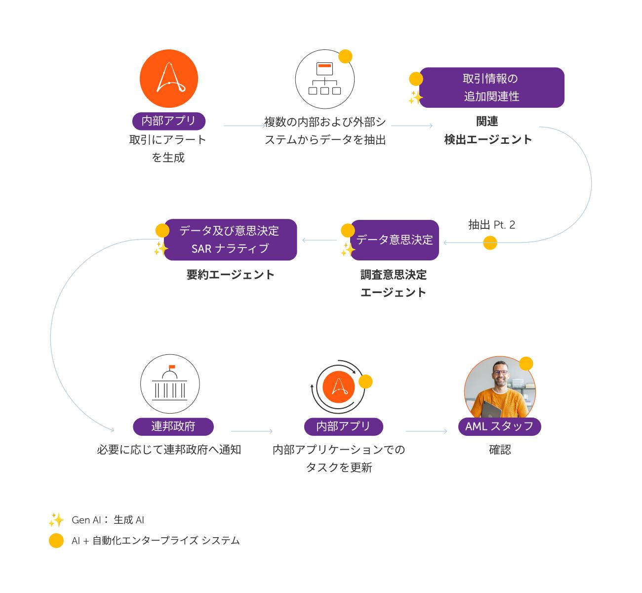 図 2: エージェンティック・プロセス・オートメーション(APA)によって AML 調査を一貫して自動化し、提案を審査し、意思決定を行うために人間が関与する仕組みです。