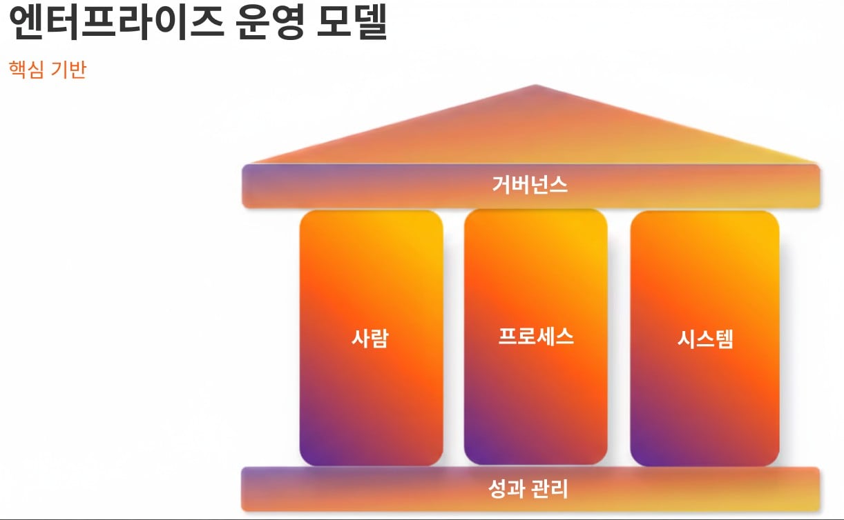 또한 사람-프로세스-기술 프레임워크를 사람-프로세스-시스템 기업 운영 모델로 업데이트했으며, 이는 성과 관리로 지원되고 거버넌스로 통제됩니다. AI가 활용되고 있는 오늘날의 환경에서 이러한 요소들이 어떻게 적응하는지 살펴보겠습니다.