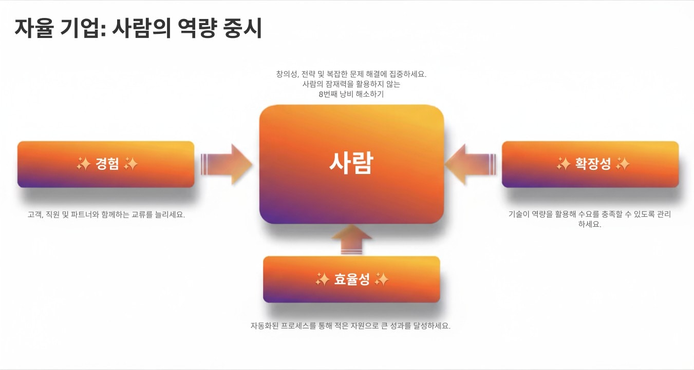 오늘날 서둘러 AI를 도입하여 자율 기업으로 나아가기 위해서는 사람들의 적극적인 참여가 중요합니다. 직원들이 AI 지식을 쌓아 AI가 자신의 핵심 직무에 어떤 영향을 미치고 변화시키는지, 그리고 자신이 맡은 임무 중 어떤 부분을 AI 에이전트와 공유할 수 있는지 더 자세히 이해할 수 있어야 합니다.